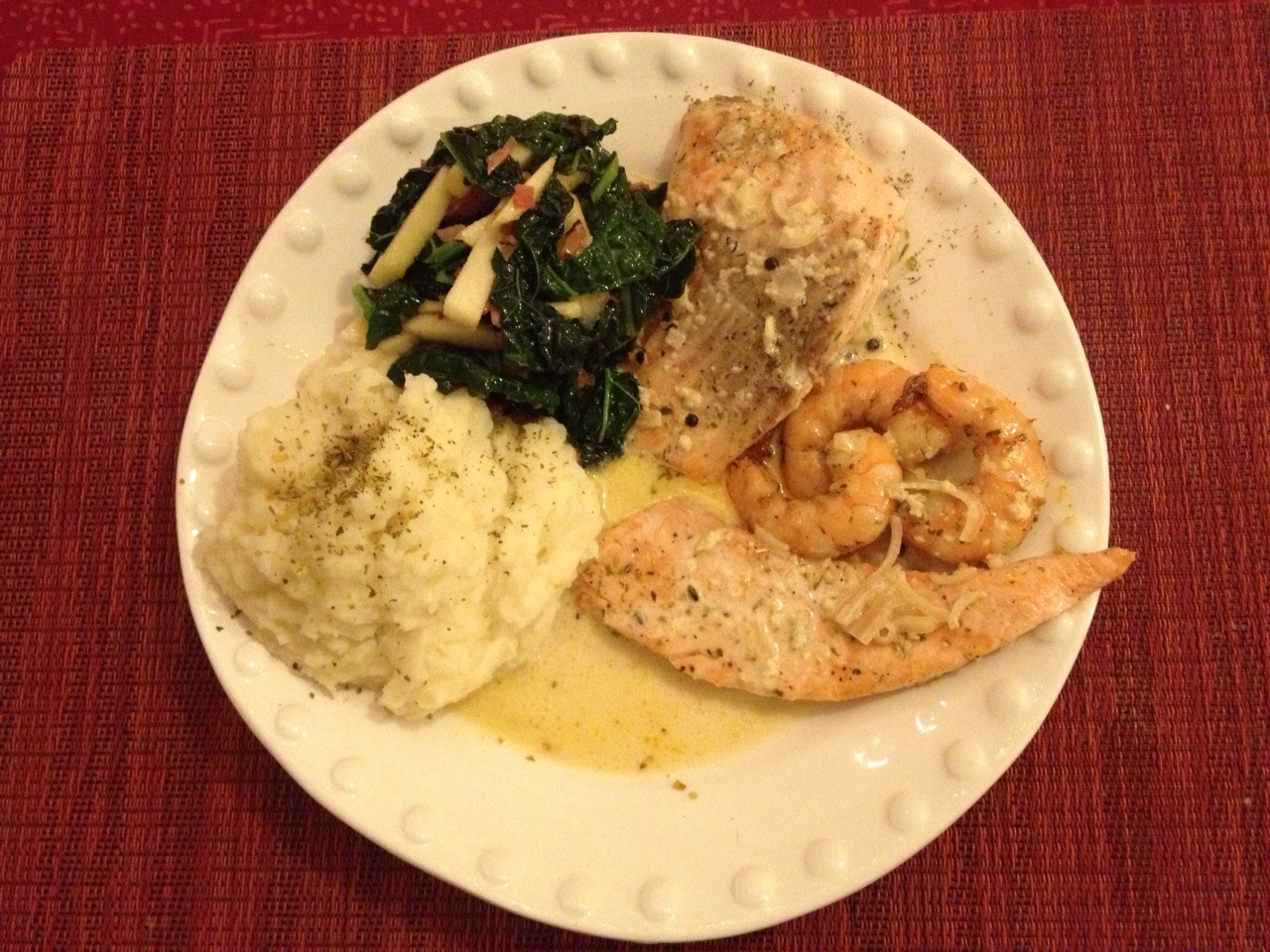 Grilled Salmon & Prawns in a Lemon & White Wine Seafood Crème Sauce W/ Garlic Mashed Potatoes and Kale & Pancetta Salad (For two)