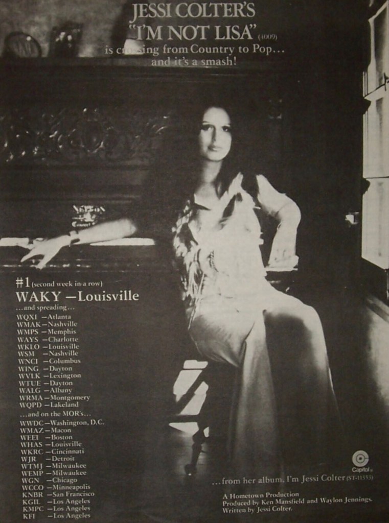 The American public, however, was mesmerized by I’m Not Lisa. With its almost ghostly piano intro and Colter’s spine-tingling, crystalline vocals, the song became a gargantuan international smash. Lisa soared to the No. 3 position on the pop charts, alongside Captain & Tennille’s Love Will Keep Us Together, America’s Sister Golden Hair, and Elton John’s Philadelphia Freedom. Moreover, the song hit the No. 1 spot on the Billboard Country Music Charts and steamrolled the Adult Contemporary Charts—a genuine “crossover,” multi-format behemoth. And the song refused to back down: I’m Not Lisa remained one of the ten longest-residing hit singles of 1975 on both Billboard and Cashbox Hot 100 and Country Lists.