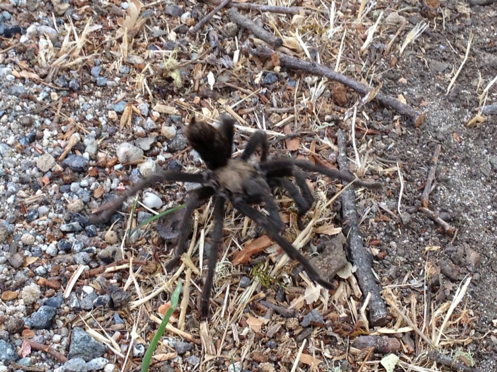 … even for tarantulas in sunny California. This male is on the move to find a Big Mama, deep in her underground burrow. If he’s lucky, he’ll get some action and escape her hungry fangs to mate again. If not, he’ll go a long way toward providing foundational nutrition for Mama and her hundreds of babies. Be quick about your business, Tarantula Daddy.